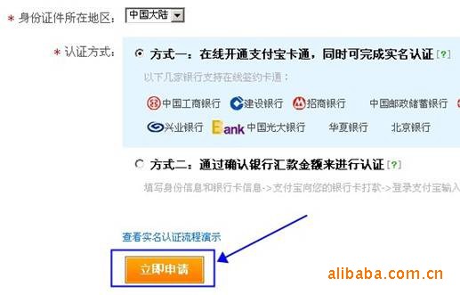 (5) 點(diǎn)擊“立即申請(qǐng)”,進(jìn)入實(shí)名認(rèn)證頁(yè)面,會(huì)有二種認(rèn)證方式選擇。具體可詳見支付寶客服中心。