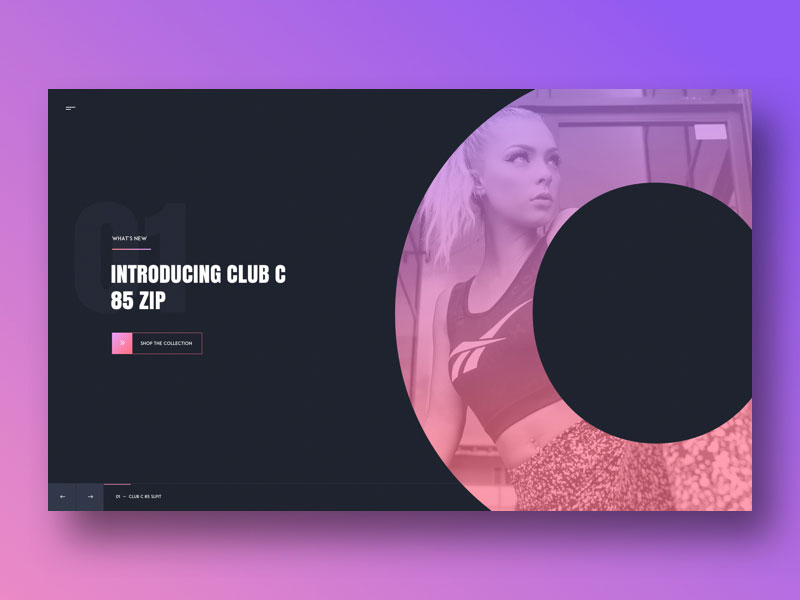 剪貼蒙板效果,可以通過底層的元素來約束上層的元素形狀。近年來流行在底層使用加粗的字母或者文字營造形式感十足的視覺效果。這個(gè)網(wǎng)頁中,圖片素材還疊加上了一層漸變色,加上黑底和文本,整個(gè)頁面簡單,但是層次并不少,比較高級(jí)。
