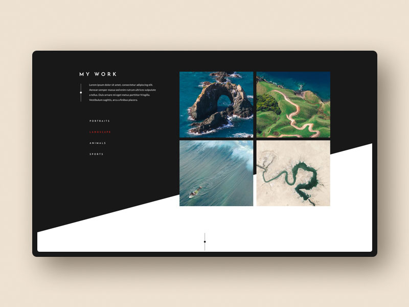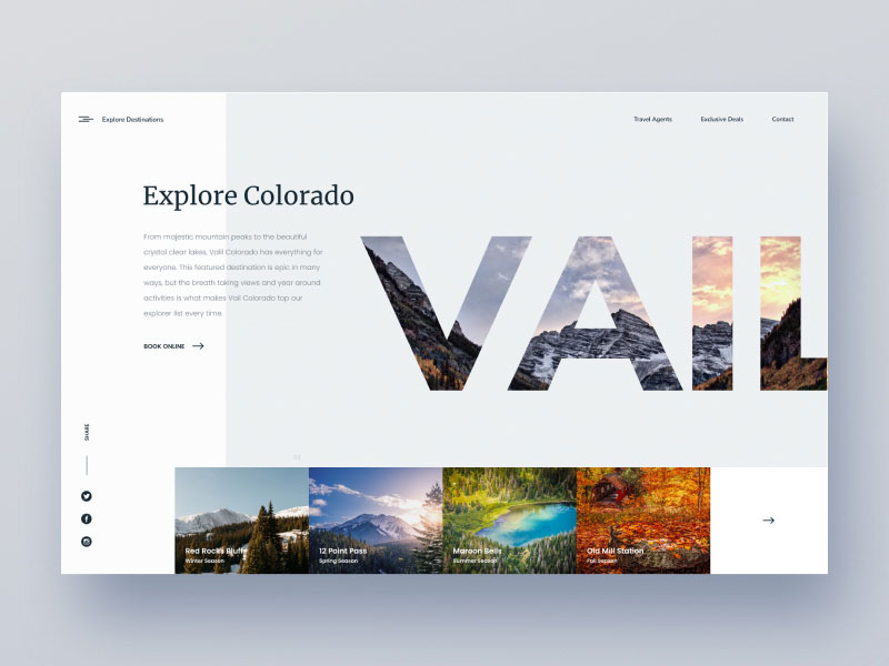 同樣是使用了文字剪貼蒙板的效果,但是這個(gè)頁面的讓被剪切圖片和文本所傳達(dá)的信息,保持了一致,圖片中的風(fēng)景所在地的名字和文本相互呼應(yīng)。切換底部圖片的時(shí)候,右上角的內(nèi)容也相應(yīng)地改變。這種設(shè)計(jì)讓布局得到了簡化,但是信息量卻倍增,相當(dāng)值得學(xué)習(xí)。